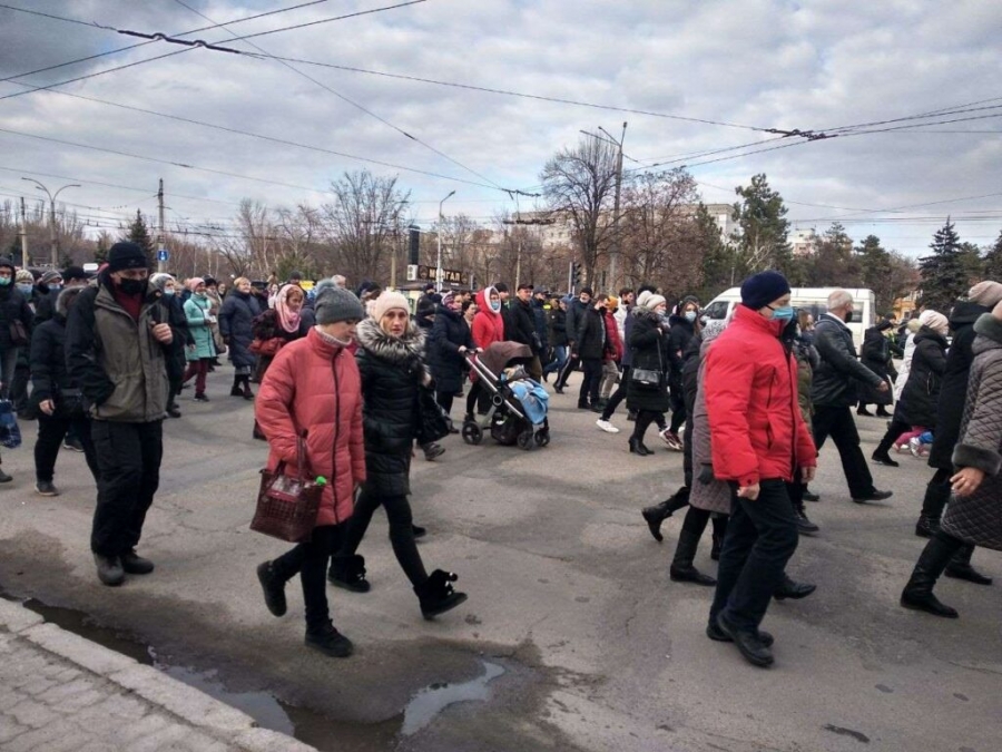 Люди собрались у храма в районе Малого рынка, далее двинулись по центральному проспекту города в сторону улицы Крепостной. Сейчас одна полоса проспекта Соборного в направлении от Малого рынка до улицы Базарной перекрыта, на перекрестках работают регулировщики, они перенаправляют водителей по объездной дороге.