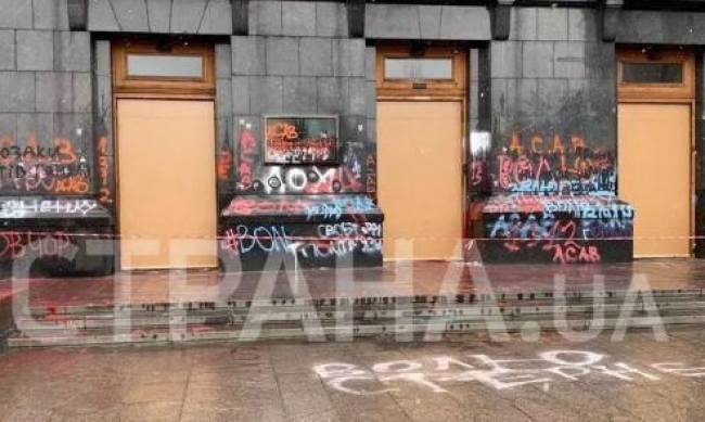 Здание Офиса президента, где в субботу вечером националисты устроили погром, все еще пестрит оставленными ими надписями. Кроме того, центральный вход остался без дверей - их сняли.