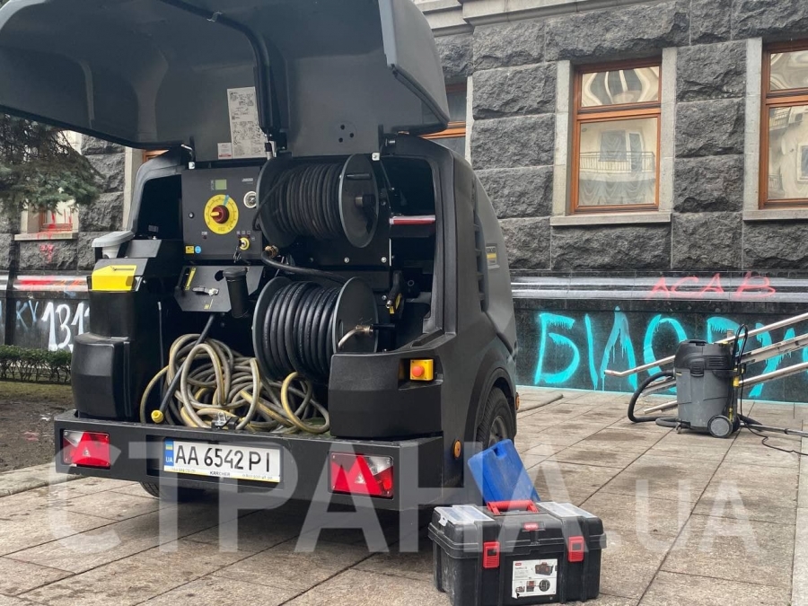 В Киеве начали отмывать надписи с фасада Офиса президента на Банковой, где в субботу националисты устроили погром.