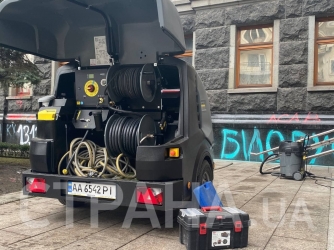 Клинеры уже начали работу. Однако краска отмывается с трудом. Работники увеличивают давление струи. Во время чистки от гранита отлетают маленькие частички.