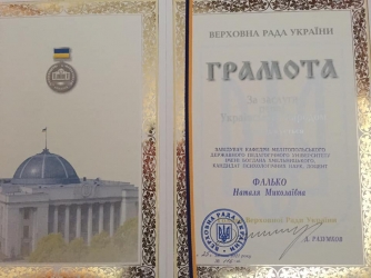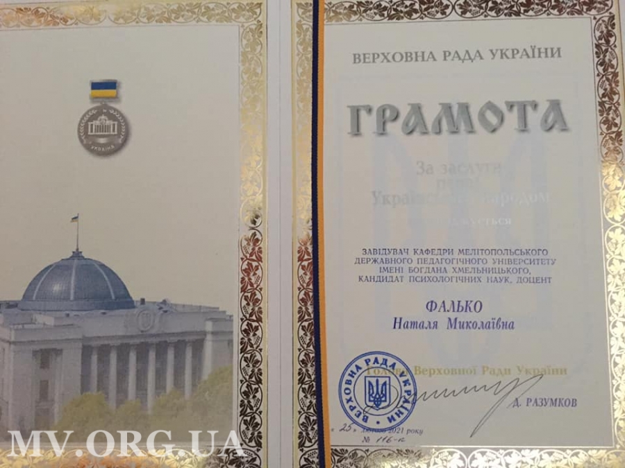 Вчера, 23 марта, заведующая кафедрой Мелитопольского государственного педагогического университета имени Богдана Хмельницкого, кандидат психологических наук, доцент Наталья Фалько получила грамоту Верховной Рады Украины "За заслуги перед Украинским народом".