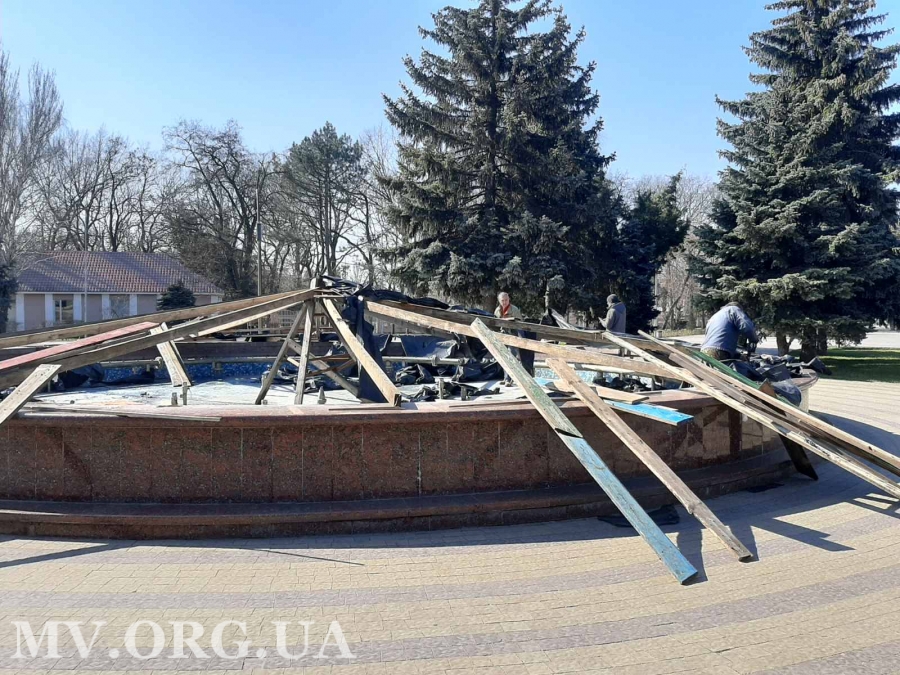 Рабочие снимают деревянный каркас и пластик, которым был укрыт фонтан на зиму.