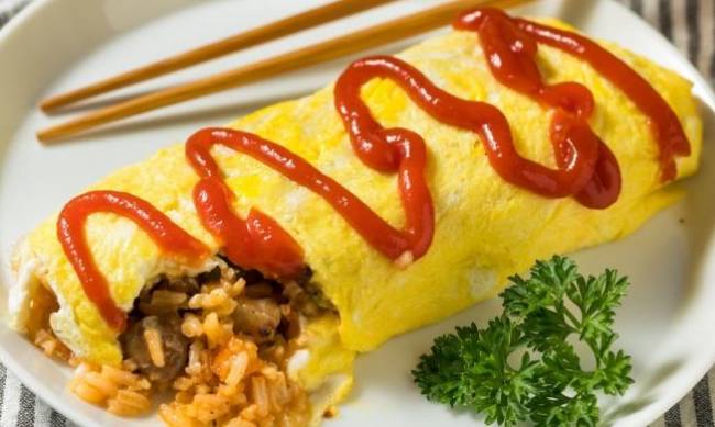 С виду это необычное японское блюдо похоже на омлет, политый кетчупом, но под ним скрывается рис с кусочками мяса и овощей. Рецепт очень прост, может включать и морепродукты, и грибы, и любые овощи.