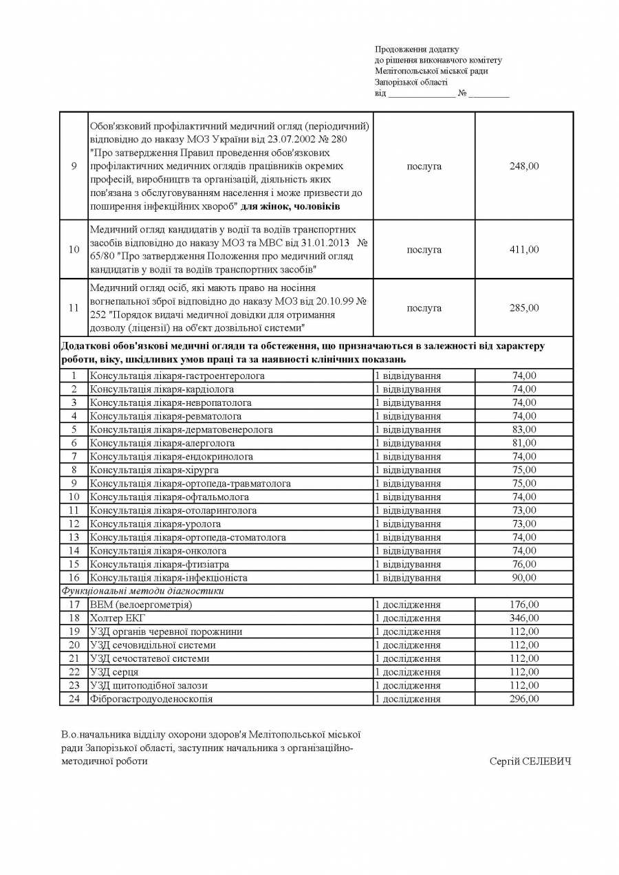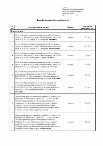 Тариф на медосмотр, а это платная услуга, последний раз пересматривался в 2019 году. Тогда члены исполкома дали «добро» на то, чтобы прием одного врача (терапевта, хирурга, стоматолога, гинеколога, кардиолога и пр.) стоил от 19 до 30 грн. Рентген органов грудной клетки стоил 63 грн, флюорография –29, пробы на стафилококк – 47 грн, на кишечную группу – 64 грн и пр.