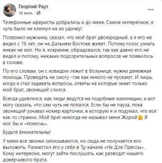Позвонил мужчина, сказал, что мой брат двоюродный, а я его не видел с 16 лет, он на Дальнем Востоке живет. Потому голос узнать никак не мог. Но я, искренне, обрадовался, так как давно его не видел и потому, никаких подозрительных вопросов не появилось в голове", - написал он.