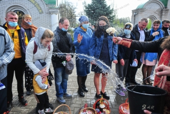 Священник поздравил всех с праздником, освятил пасхальные куличи и окропил прихожан святой водой.