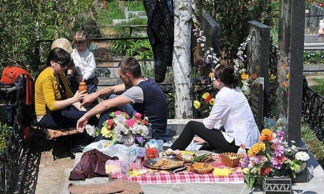 - Издавна в народе считается, что на кладбище нужно приходить с угощениями для усопших, которые оставляют около могилы у надгробия. Часто для этого берут сладости и мучные изделия (хлеб, освещенные паски), спиртное (как правило - водку). Если покойный при жизни курил, приносят и сигарету. Также часто родственники кушают и пьют возле могилы, таким образом словно вместе с покойным. Между тем, такой обычай восходит еще к языческим тризнам, и церковь не поощряет эти действия.