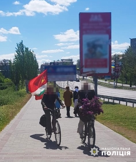 9 мая около 13:30 во время несения службы сотрудниками группы реагирования патрульной полиции Мелитопольского РУП на проспекте 50-летия Победы в Мелитополе были замечены два велосипедиста, которые имели запрещенную символику: женщина – красный флаг с серпом и молотом, а мужчина - георгиевскую ленту, что является нарушением ч. 1 ст. 4 Закона Украины «Об осуждении коммунистического и национал-социалистического (нацистского) тоталитарных режимов в Украине и запрете пропаганды их символики» запрещено изготовление, распространение, а также публичное использование символики коммунистического тоталитарного режима, символики национал-социалистического (нацистского) тоталитарного режима, в том числе в виде сувенирной продукции.