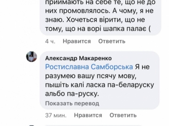 "Я не разумею вашу псячу мову, пышіть калі ласка па-беларусску альбо па-русску. Я ня мовлю ўкраінскай мовой і паперы пышу па-руску, хоць ведаю яе. Для мяне гэта ваша ўкраінская мова - мова окупантаў та фашыстаў", - написал Макаренко.