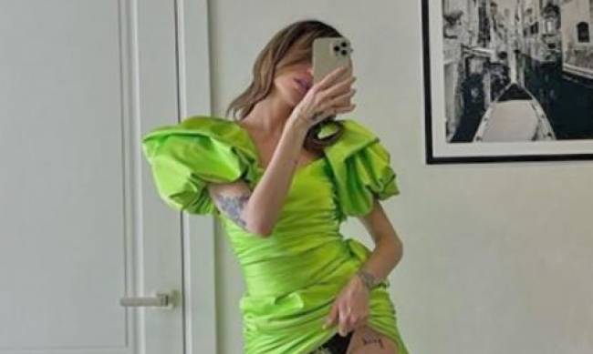 В кадре дерзкая поп-звезда задрала подол кислотного платья, чтобы сверкнуть черными стрингами с зеленым скорпионом.