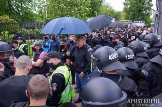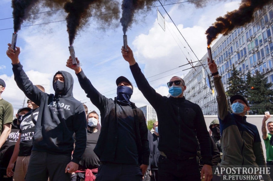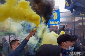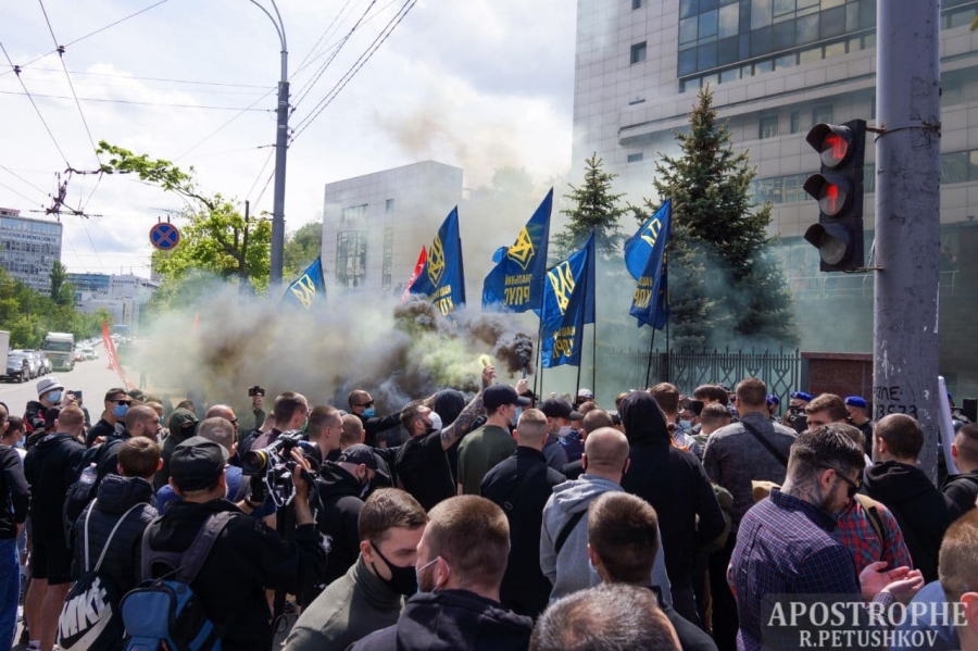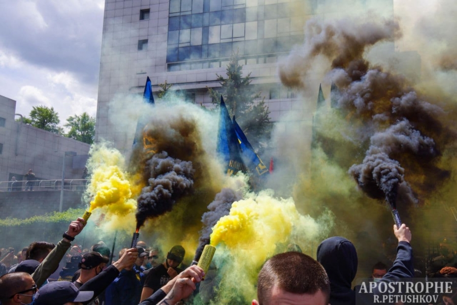 14:32 После очередной порции яиц в сторону сторонников Медведчука националисты снова зажгли пиротехнику и ушли от суда. На данный момент ситуация под судом спокойная. Охрана Медведчука осталась.