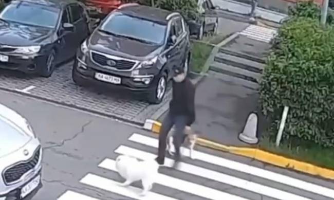 На опубликованном видеоролике видно, как один мужчина выгуливал своего питомца, и в этот момент подошел другой со своей собакой.