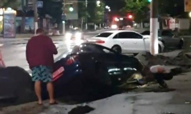 Вчера вечером на ул. Героев Украины в Мелитополе легковой автомобиль провалился в яму.