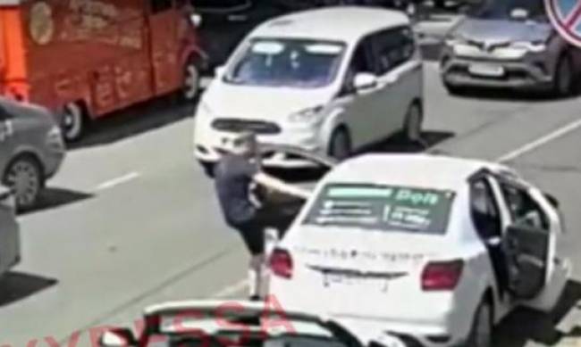 В Одессе на Екатерининской улице на таксиста напал водитель недовольный тем, что тот остановился в неположенном месте, соответствующее видео опубликовал телеграм-канал Х@евая Одесса.