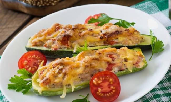 6. Заполнить кабачки подготовленной начинкой и посыпать тертым сыром.