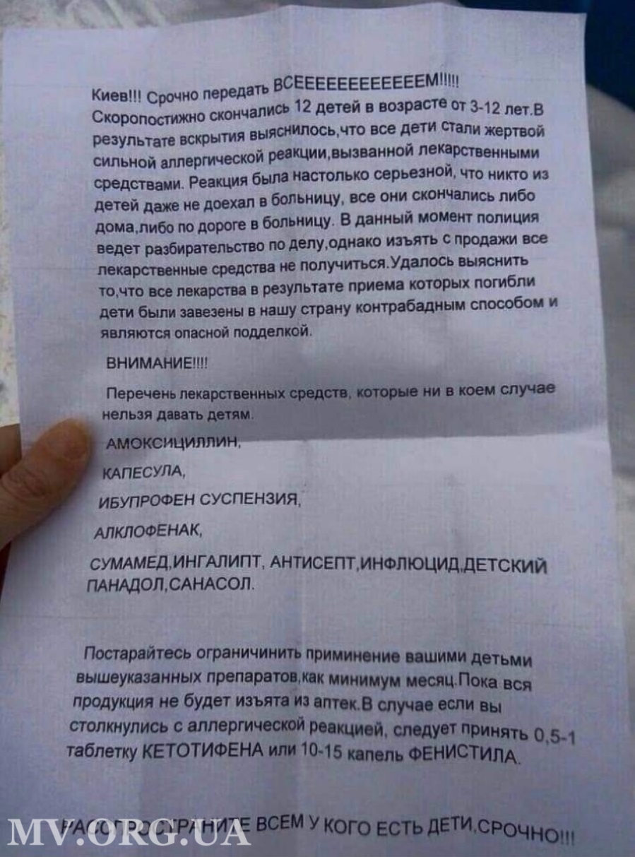 История о 12 детях, которые скончались от приема распространенных лекарств, уже успела облететь многие чаты в мессенджерах и группы в соцсетях. В тексте сообщения говорится о том, что эти препараты, среди которых инфлюцид, сумамед, ингалипт и другие, будто бы поступили в нашу страну контрабандой. В заключение автор послания призывает родителей ограничить применение этих лекарств, пока вся продукция не будет изъята из аптек.
