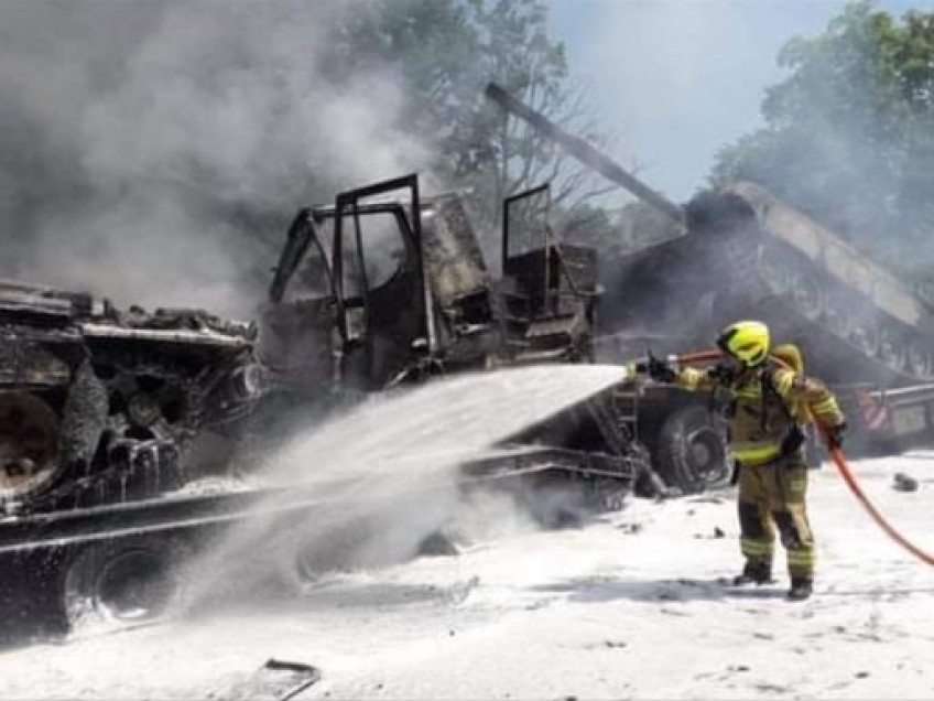 На автостраде А6 столкнулись два эвакуатора в военной техникой. В результате ДТП вспыхнул огонь, который перекинулся на военную технику, что транспортировали на платформах эвакуаторы.
