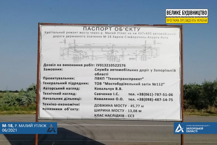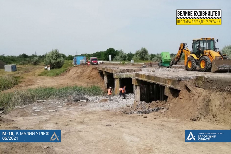 Начат капитальный ремонт моста через реку Малый Утлюк, расположенного на трассе Харьков-Симферополь, недалеко от Мелитополя. Частичный ремонт был признан нецелесообразным и мост перестроят полностью.