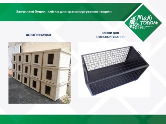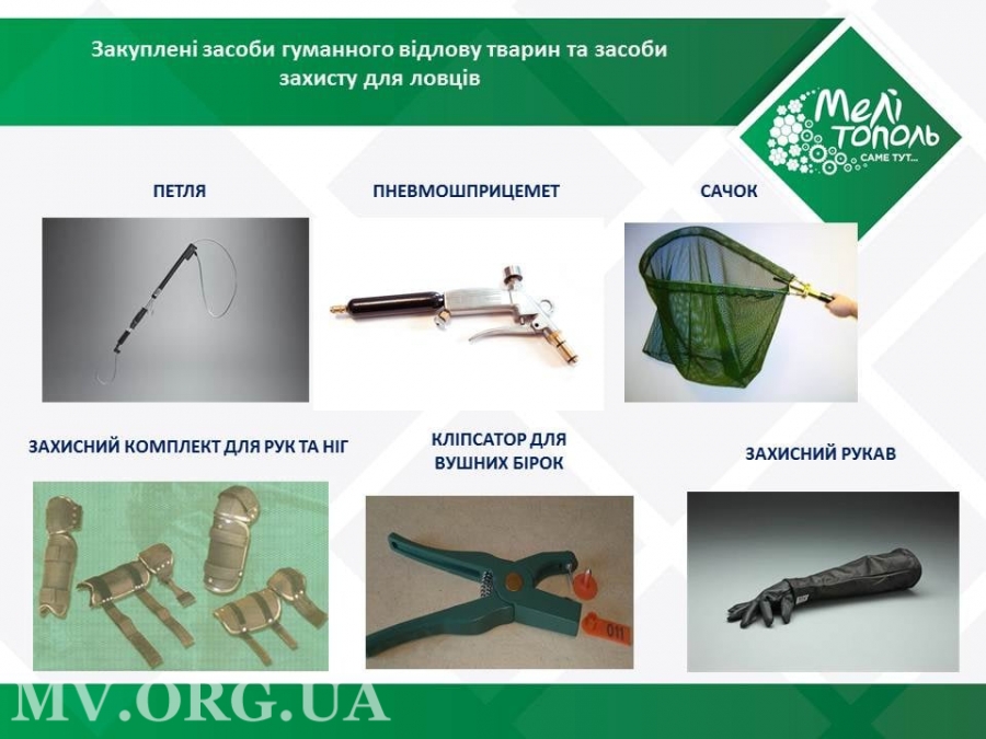 На баланс КП также передано транспортное средство, на котором животных будут доставлять в центр передержки, закуплены будки и клетки для их транспортировки. Также для этих целей приобрели средства гуманного отлова животных (петля, пневмошприцемет, сачок, клипсатор для ушных бирок), а также защитный комплекс для рук и ног, специальный рукав. На мероприятия, направленные на уменьшение количества бродячих животных в Мелитополе, из городского бюджета выделено 1,2 млн грн.