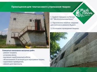 Помещение, в котором в ближайшее время обустроят центр передержки бездомных животных, уже передано на баланс КП "Мелитополькомунтранс". Напомним, здание расположено на очистных сооружениях на территории Новенской ОТГ. Планируется ремонт кровли, установка окон, внутренние отделочные работы, обустройство 25 вольеров для временного содержания животных, карантинное помещение и комната для персонала.