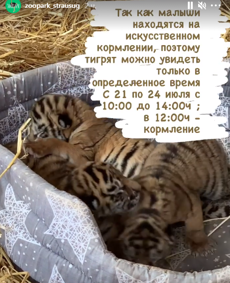 Родились два мальчика и девочка. Но, к сожалению, мама-тигрица отказалась от своих малышей, проявив к новорожденным полное безразличие. Теперь тигрята полностью на искусственном вскармливании. В связи с этим посмотреть на тигрят можно только в определенные часы.