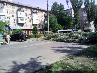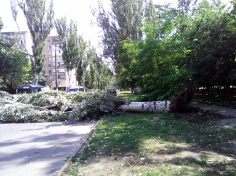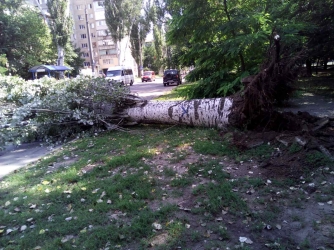 Огромный тополь рухнул на проезжую часть. К счастью, ни люди, ни автомобили, ни строения в результате происшествия не пострадали.