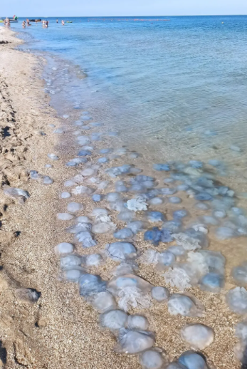 В Бердянск опять вернулись медузы. Практически весь берег укрыт эти морскими обитателями. Туристам приходится отдыхать на берегу, так как в море зайти не возможно.