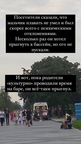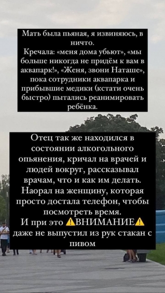 Отец ребенка тоже был в состоянии алкогольного опьянения. Когда в аквапарк прибыли медики скорой помощи и стали проводить реанимацию, папа мальчика, с бокалом пива в руках, кричал на врачей и давал советы как правильно реанимировать сына.