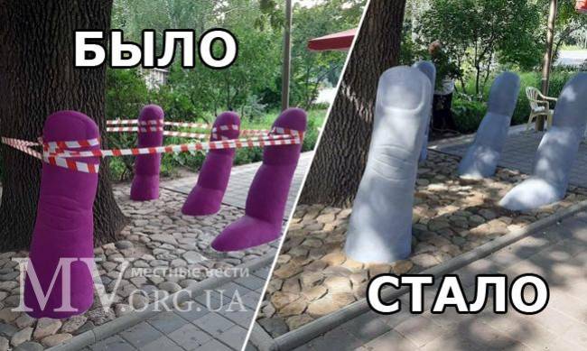 Еще в июле месяце пальцы были ярко-лилового цвета, а теперь сменили цвет на белый. Вероятно, из-за неоднозначной реакции горожан.