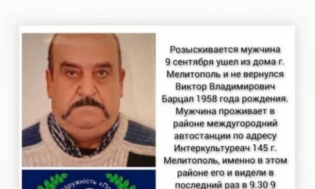 "Разыскивается Виктор Барцал, 1958 г.р. 9 сентября он ушел из дома в Мелитополе и не вернулся. Последний раз мужчину видели в районе междугородней автостанции по ул. Интеркультурной. Был одет в байковую клетчатую кофту и черные брюки", - сказано в сообщении.