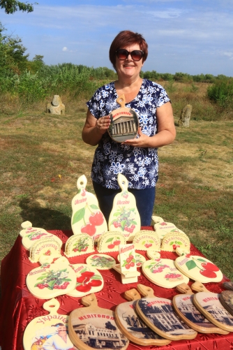 А вот работы Галины Ляшко. Ее досочки и подставки для телефона с изображением бренда нашего города - черешни - уже разъехались в ближнее и дальнее зарубежье - есть и в Америке, и во Франции, и в Нидерландах, и в Швеции, и в Чехиии, есть такая работа даже у пятого президента Украины Петра Порошенко.