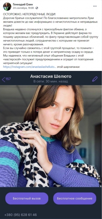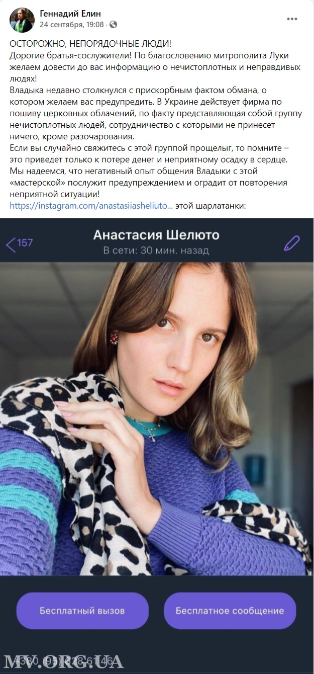 Владыка недавно столкнулся с прискорбным фактом обмана, о котором желаем вас предупредить. В Украине действует фирма по пошиву церковных облачений, по факту представляющая собой группу нечистоплотных людей, сотрудничество с которыми не принесет ничего, кроме разочарования.