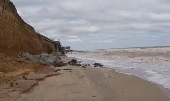 В Кирилловке сильный шторм продолжает размывать пляжи. Вода подобралась настолько сильно к берегу, что произошел обвал грунта. Кроме того, большие камни угрожают свалиться буквально на головы отдыхающим.