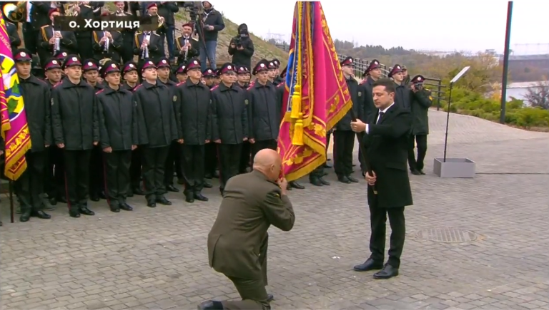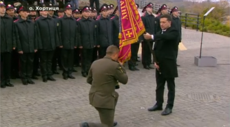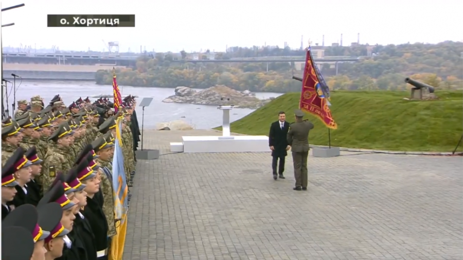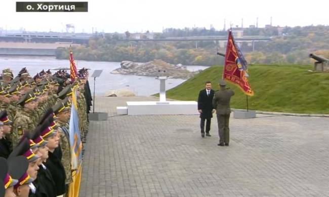 В Запорожье на острове Хортица президент Украины Владимир Зеленский принял участие в торжествах по случаю Дня защитника и защитниц Украины. Глава государства вручил командирам воинских подразделений боевые флаги и ленты с почетными наименованиями.