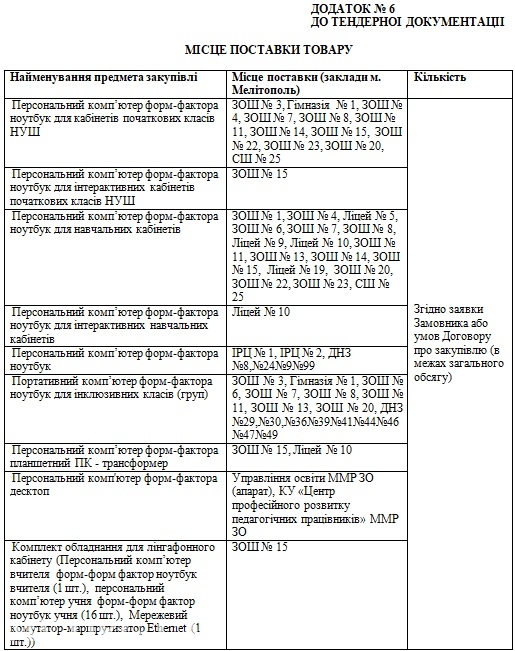 Согласно тендерной документации, достанется техника школам и детсадам города. Особенно подфартит недавно отремонтированной ООШ № 15. Учебному заведению намерены передать оборудование для лингафонного кабинета, состоящее из одного учительского и 16 ученических ноутбуков, а также интерактивный ноутбук для кабинета НУШ и ноутбуки для учебных классов. Также ноутбуки для начальных классов НУШ получат ООШ №№ 3, 4, 7, 8, 11, 14, 22, 20, СШ №№ 23, 25 и гимназия № 1. Ноутбуки для учебных кабинетов предусмотрены для школ №№ 1, 4, 5, 6, 7, 8, 9, 10, 11, 13, 14, 15, 19, 20, 22, 23, 25. Кроме того, лицей № 10 получит ноутбук для интерактивного учебного кабинета и планшетный ПК-трансформер, такой же, как предназначен и для ООШ № 15.