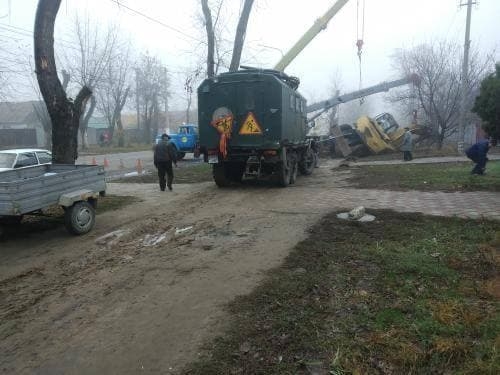 Во время проведения ремонтных работ в районе лицея №19 в Мелитополе под землю провалился экскаватор. На данный момент коммунальщики пытаются его выручить из земляного плена.
