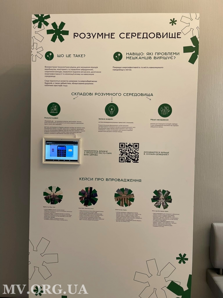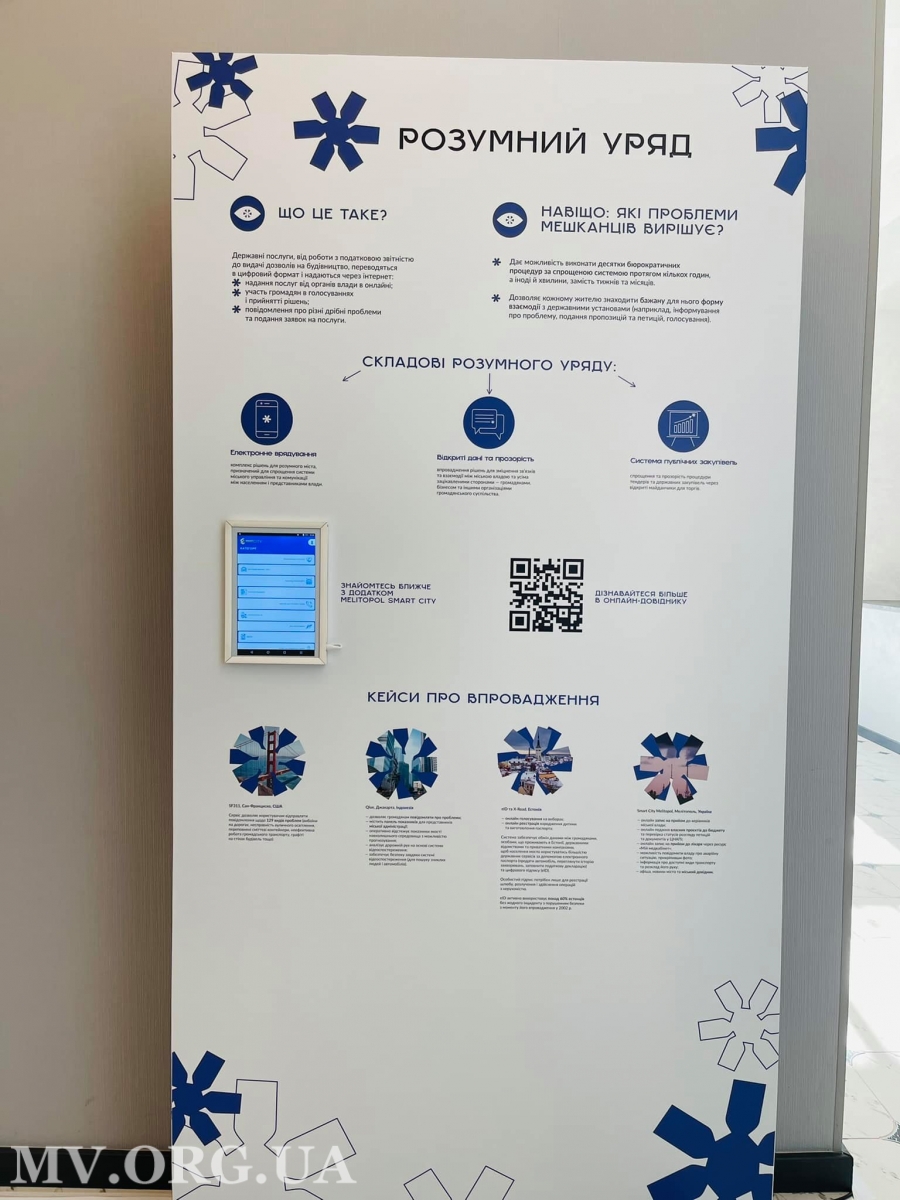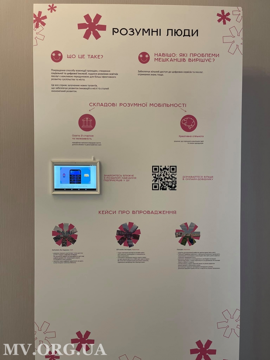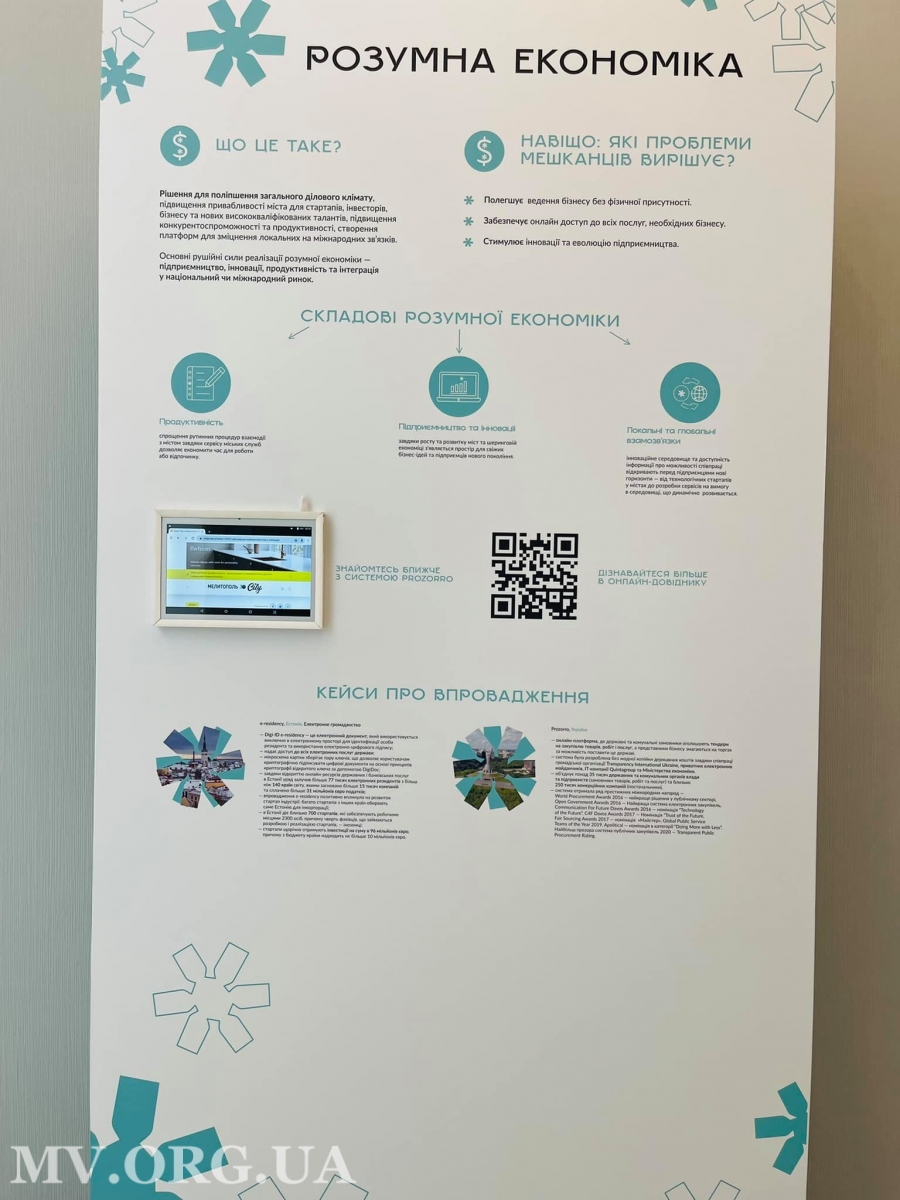 Экспонаты - стенды с QR-кодами, выставленные в фойе ЖДК - знакомят мелитопольцев с составляющими "умных городов". К примеру "умная мобильность" - это различные системы, которые позволяют улучшить качество услуг городского транспорта, появление новых средств передвижения - более экологичных и дешевых. "Умная среда" - это использование технологий для уменьшения выбросов вредного производства и их мониторинг, применение энергоэффективных технологий.