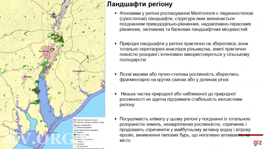 На этой неделе мелитопольцев, как сообщали "МВ", знакомят с результатами работы экспертной группы, которая разработала проект интегрированного развития города на ближайшие 10 лет. Один из его важных пунктов - сфера экологии, изменения климата и рекреации. Среди сильных сторон города в этом направлении эксперты отмечают ландшафтное разнообразие территории, присутствие реки Молочной и объектов природно-заповедного фонда в границах города, достаточное общее озеленение жилых кварталов. К слабым относят загрязненность балок, низкое качество воды в реке и в ручьях-притоках, недостаточная площадь зеленых зон общего пользования, отсутствие парков в пешей доступности в большинстве районов, загрязненность почв тяжелыми металлами, преобладание производственных территорий.