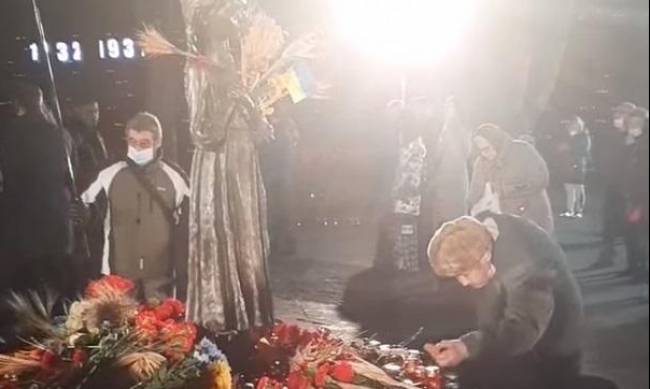 После завершения официальной части акции, на которой много и правильно говорилось о недопущении подобного вновь, пожилой мужчина смог взять себе хлеба и яблок, что были возложены вокруг памятника жертвам голода в Украине.