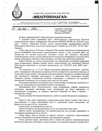 В ответе на запрос редакции "МВ" в ЧАО Мелитопольгаз поясняют, что согласно Правилам безопасности газоснабжения, принятым Минэнергетики в 2015 году, комплексное приборное обследование полиэтиленовых газопроводов (обследование газопровода без разрытия) проводится в зависимости от его" возраста", но не реже чем раз в пять лет. Обследуют газопровод от места присоединения до запорного устройства включительно - то есть как раз трубу которая ведет от уличного газопровода до газопровода-ввода включительно.