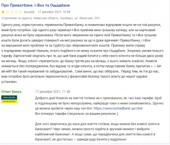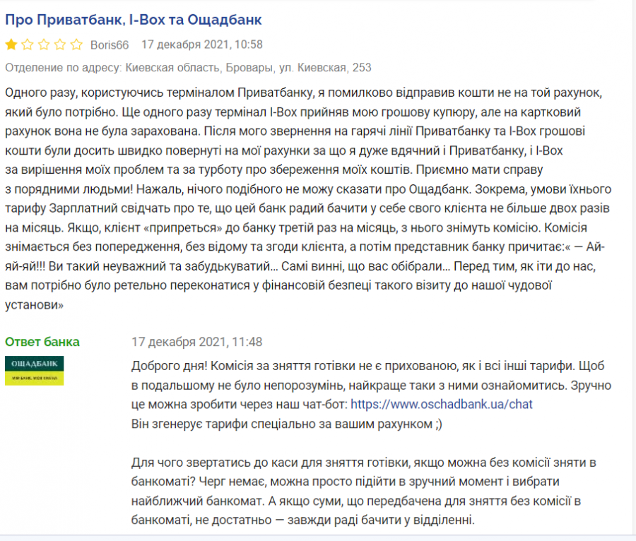 В Ощадбанке на жалобу клиента отреагировали и ответили, что ему тщательней надо изучать условия договора с банком и его тарифами. А также деньги лучше снимать в банкомате, так как там не снимают комиссию за снятие зарплаты.