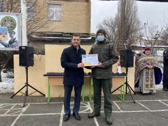 Глава Мелитопольского районного совета Сергей Прийма вручил нацгвардейцам награды Мелитопольского городского и Мелитопольского районного советов, и подарок батальону - сертификат на приобретение техники.