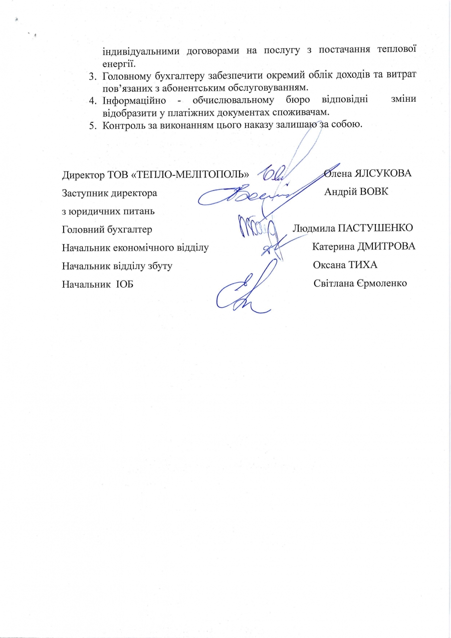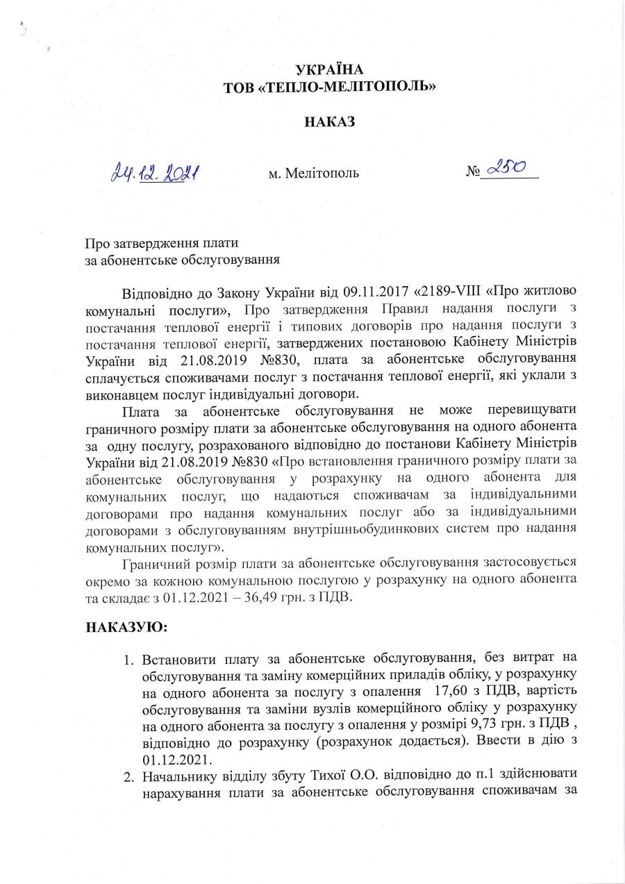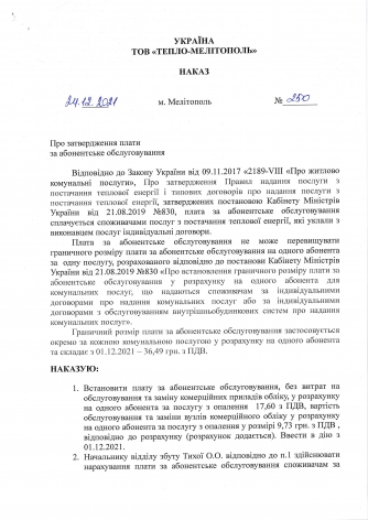 Приказ об установлении абонплаты для потребителей, которые заключили индивидуальный договор на поставку тепла опубликован на сайте ООО "Тепло Мелитополь".