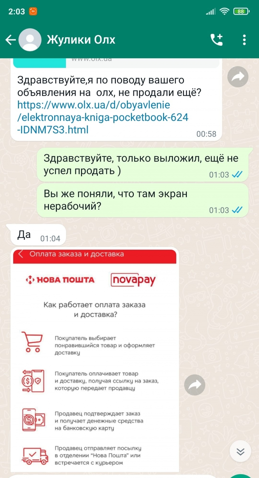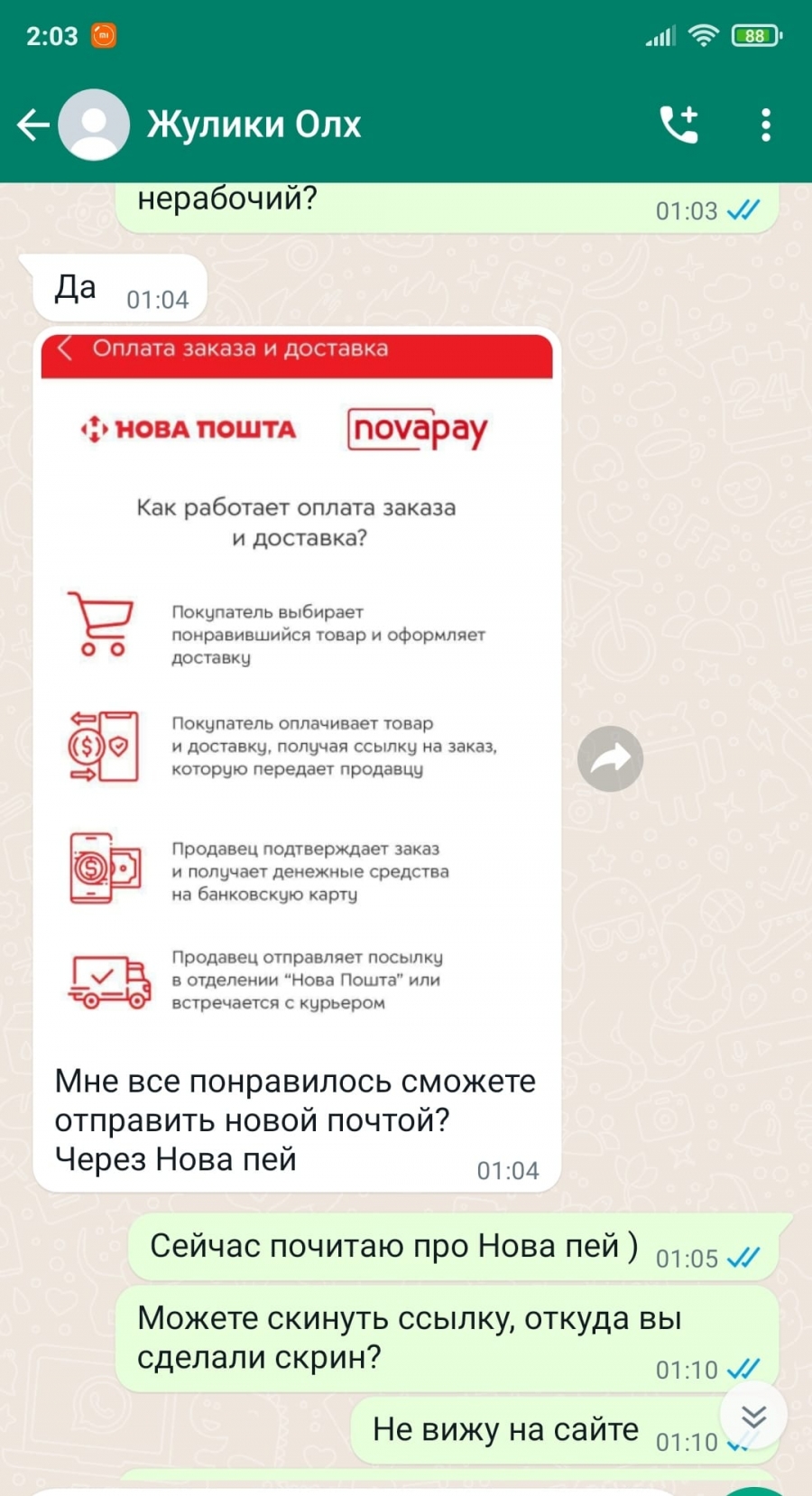 "В Whatsapp пишет некая Анастасия и говорит, что готова купить товар с помощью новой услуги novapay (типа OLX-доставки, с которой все как раз ок, только якобы от "Новой почты")", - описывает ситуацию Фульмахт.
