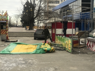 В этом году в праздничные дни на центральной площади горожанам были доступны разного рода развлечения - от катания с горки на надувных санках и стрельбы в тире, до просмотра фильмов в кинотеатре 9D и проката детских машинок. И уже на этой неделе после Крещения собственники аттракционов приступили к их разбору. К примеру, от горки для тюбинга к обеду 20 января, осталась только "касса", от тира - каркас, и работы еще в разгаре.