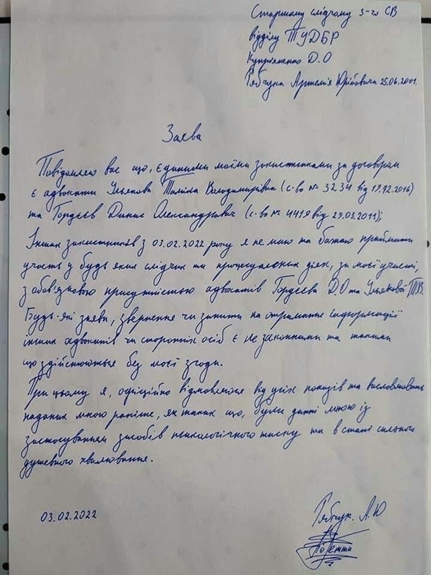 "Мной было подано заявление о внесении в ЕРДР данных о том, чтобы было открыто производство по четырем статьям УК, где я требую признать Артемия потерпевшим", - цитирует издание адвоката.