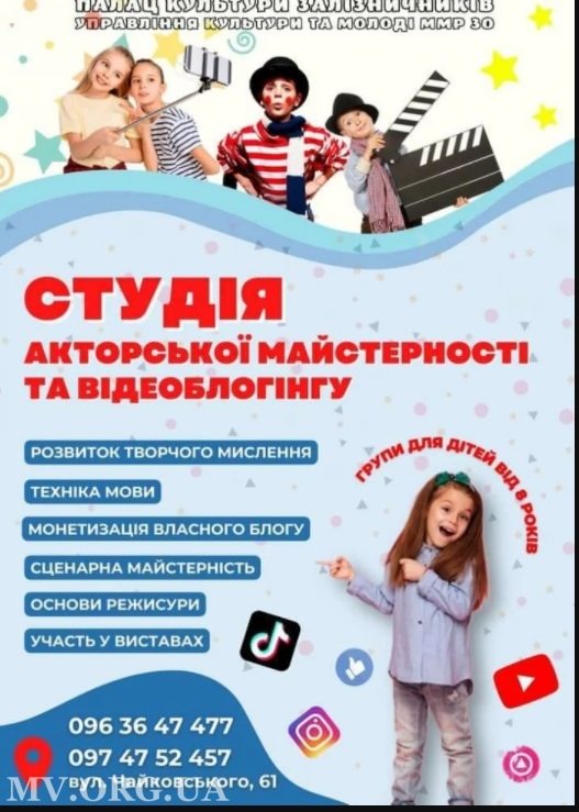 Детвора от 8 лет может записаться в студию актерского мастерства и видеоблогинга. В программе занятий - развития творческого мышления, техника речи, монетизация собственного блога, сценарное мастерство, основы режиссуры. А все освоенные навыки можно будет опробовать, участвуя в спектаклях.