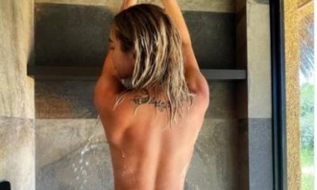 Женщина разместила фотографию, на которой она стоит под душем в одном только в нижней части купальника. Ольга отвернулась спиной к камере, спрятав таким образом грудь, и подняла руки.