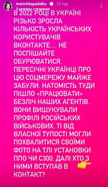 «В 2022 році в Україні різко зросла кількість українських користувачів Вконтакте... Не поспішайте обурюватися. Пересічні українці про цю соцмережу майже забули. Натомість туди пішло «працювати» безліч наших агентів. Вони вишукували профілі російських військових. Ті від власної тупості могли похвалитися своїми фото на фоні ППО чи С300.