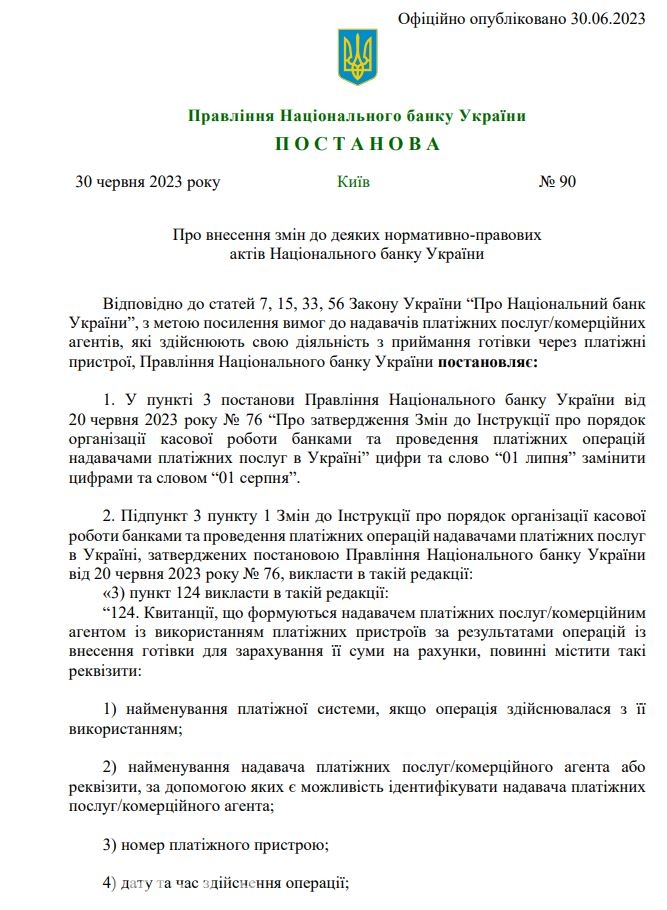 З 1 серпня 2023 року Нацбанк додає реквізити до квитанцій, які додатково мають містити номер мобільного телефону платника – на нього повинен прийти код з паролем.